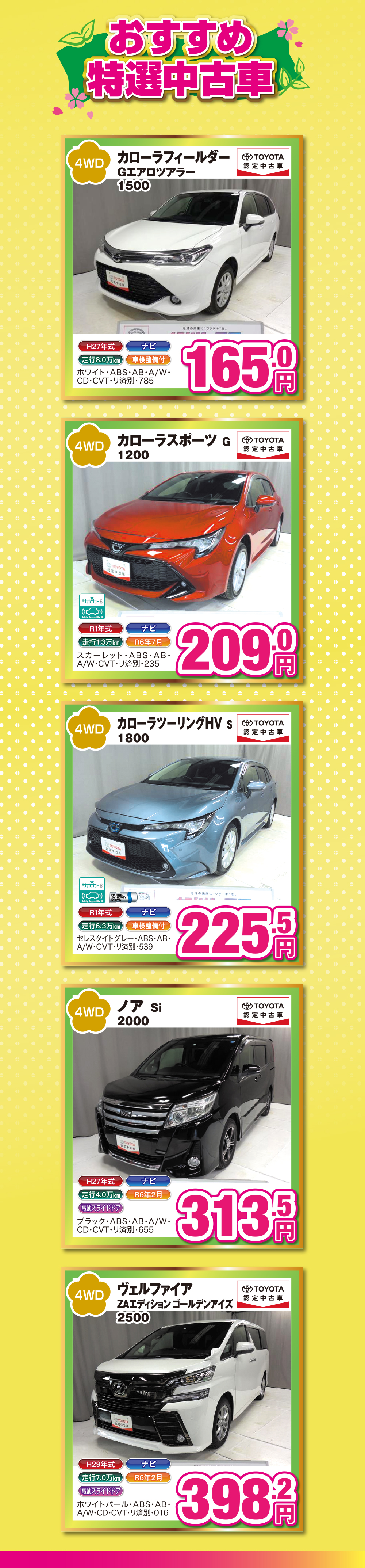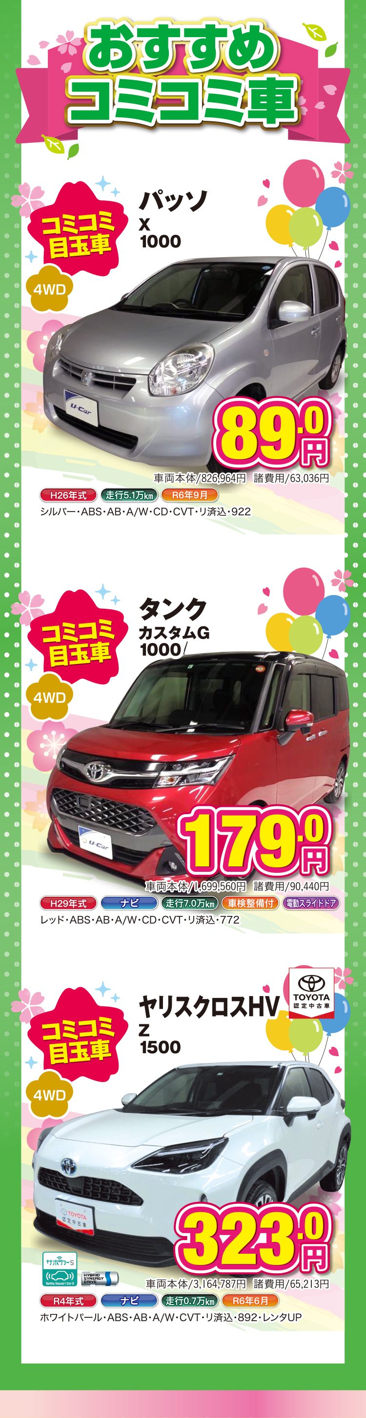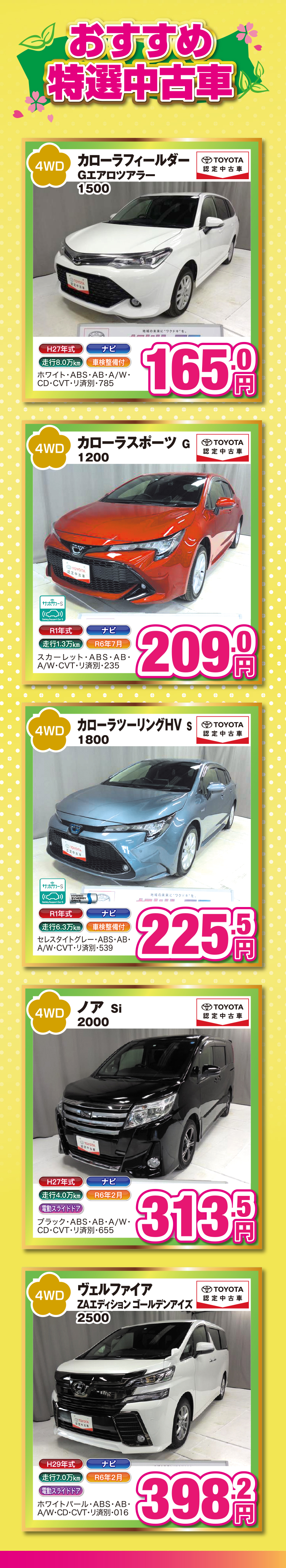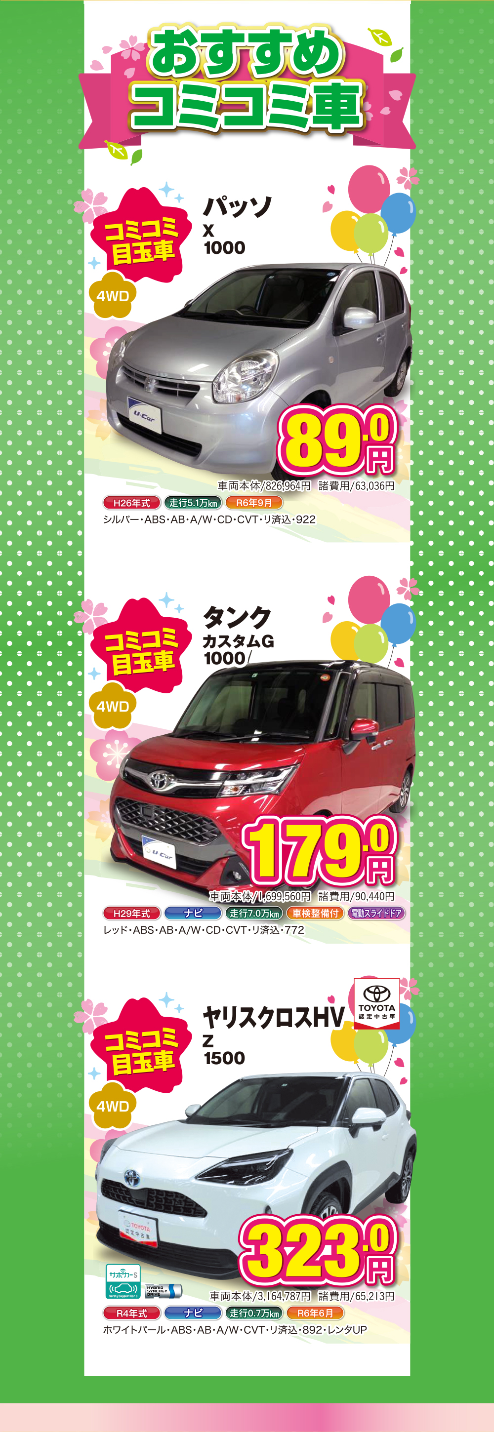 特記事項がない場は合フル装備付となります。 ●フル装備…A/C、P/S、P/W付 ●A/C…エアコン ●P/S…パワーステアリング ●P/W…パワーウィンドウ ●A/W…アルミホイール ●AT…オートマチック ●MT…マニュアル ■登録諸費用、税金(消費税は除く)保険料、代行手数料等は別途申し受け致します。(コミコミ車は除く) ■リサイクル表示の次にある数字は車台番号の下3桁です。※修復歴有りの修復箇所や内容はお問合せ下さい。(自動車リサイクル法施行により) ■「リ済込」リサイクル料金は預託済みで預託金相当額が価格に含まれています。「リ済別」リサイクル料金は預託済だが表示価格に含まれていないため別途必要。※2023年2月21日現在の展示車掲載です。